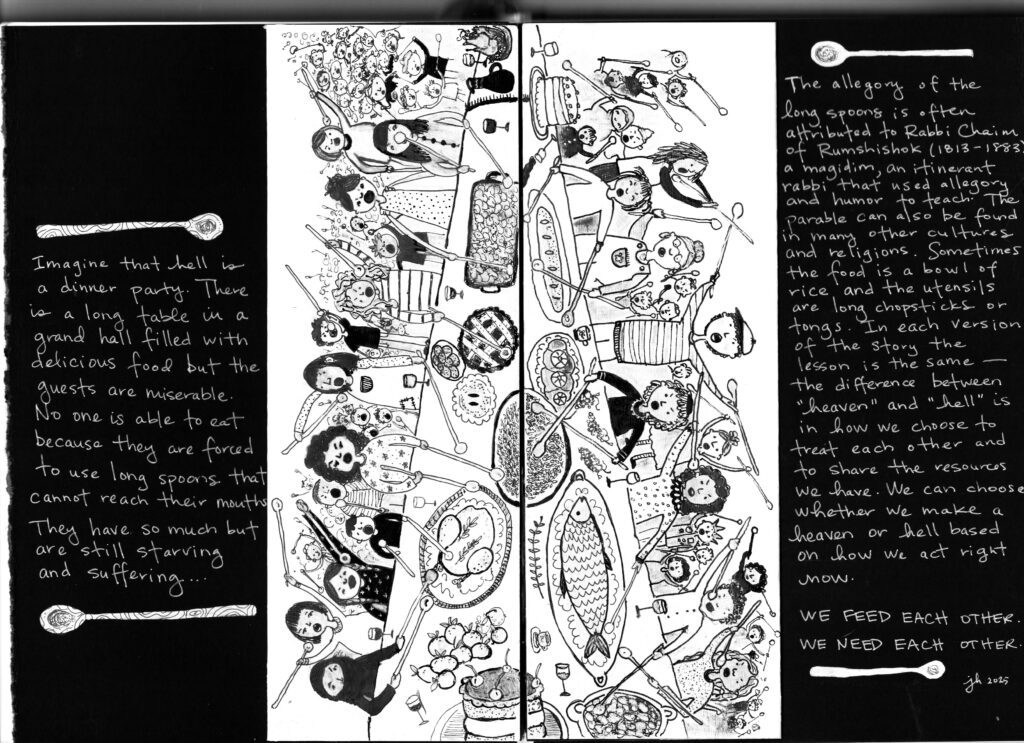 The allegory of the long spoons is often attributed to Rabbi Chaim from Rumshishok (born Rabbi Chaim Elchanan Tzadikov z”l, 1813-1883) who was a magidim or itinerant rabbi that used allegories and humour to teach. The parable can also be found in many other cultures and religions, sometimes the food is a bowl of rice and the utensils are long chopsticks, other times a bowl of stew or tongs. In each version of the story the lesson is the same — the difference between “heaven” and “hell” is in how we choose to treat each other and share the resources we have.