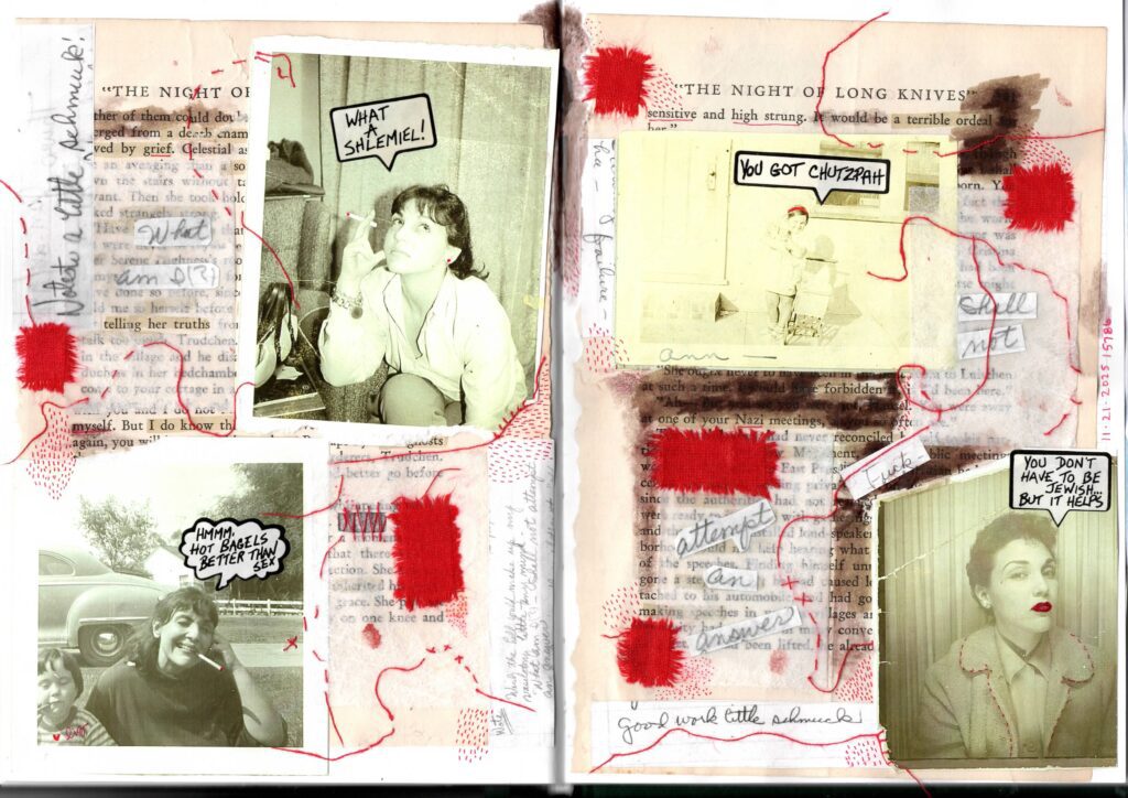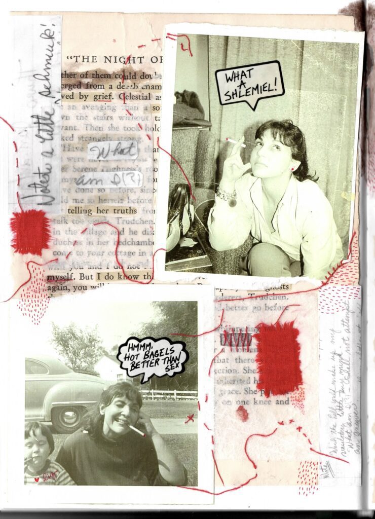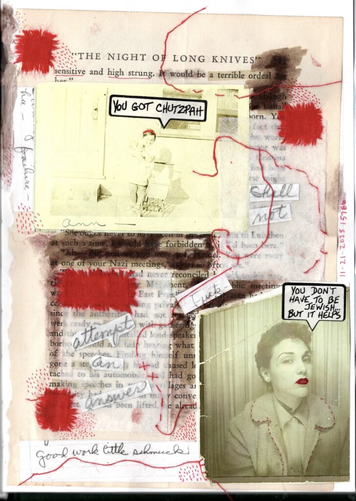 Collage of photocopied photos of my Nana, one of her and Lizzie; scraps of fabric and red thread torn during Rabbis for Ceasefire Yitzkor service; vintage Jewish stickers given to me by my oldest kiddo; pages of an old fiction book about Nazis; photocopies of my Nana’s handwritten notes 1998/99.